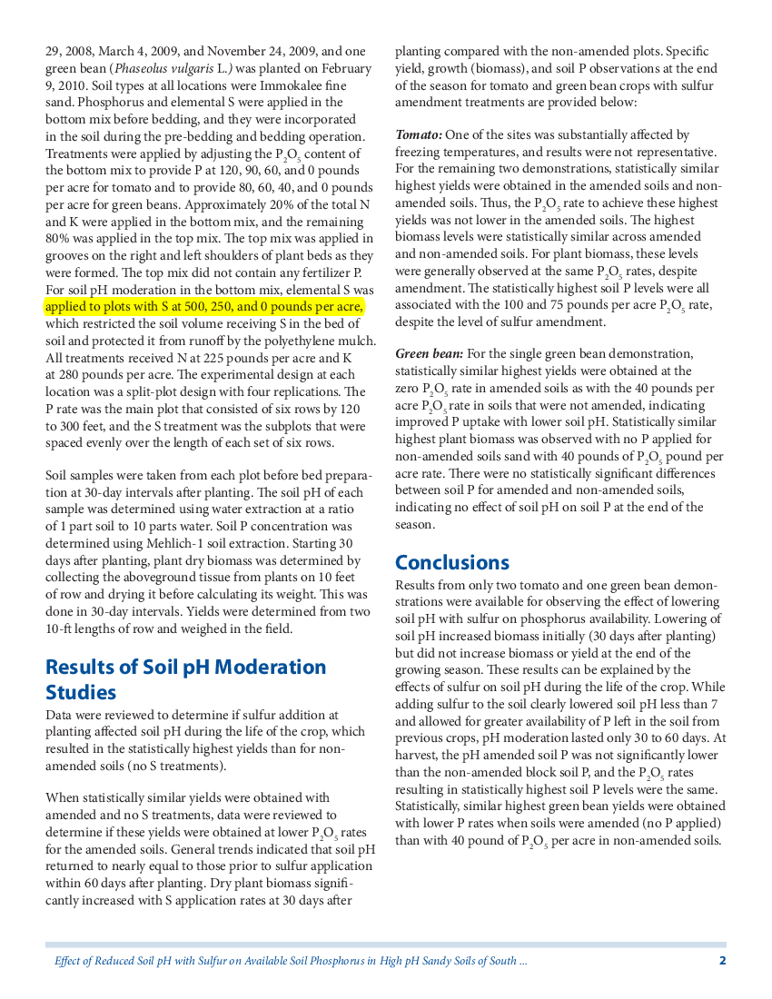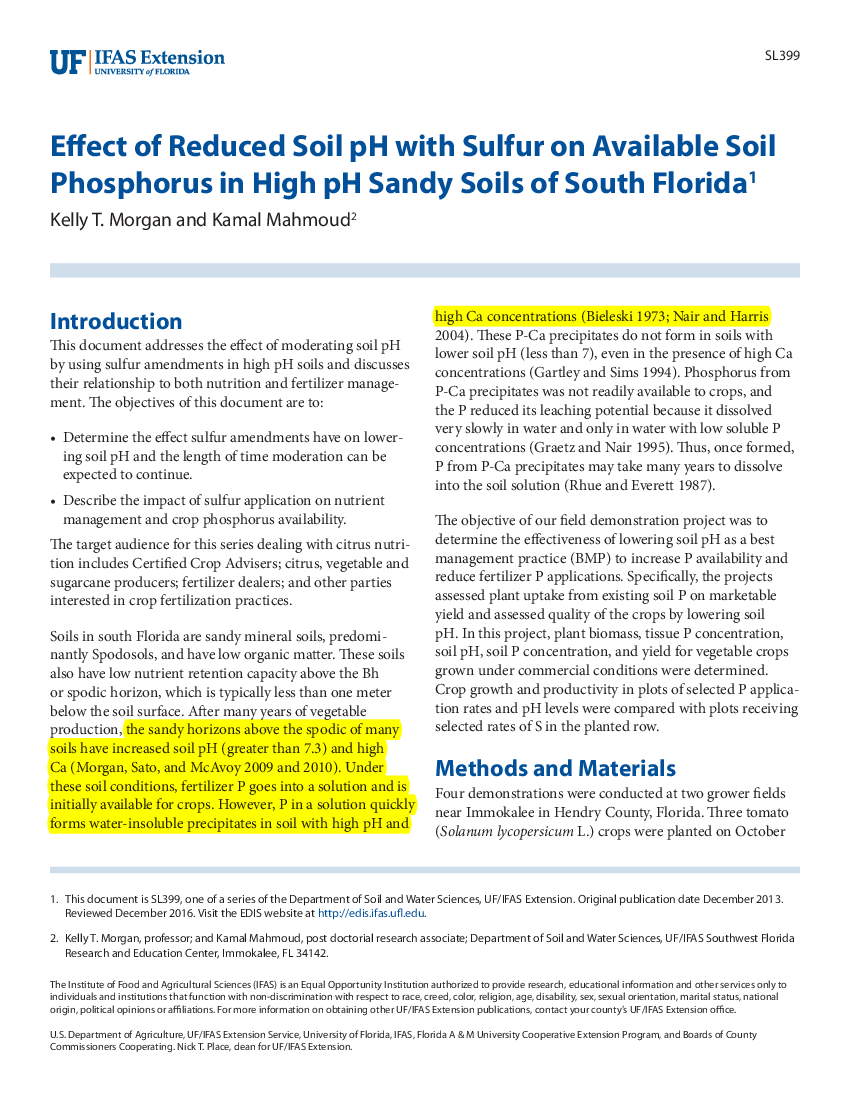 简介:Effect of Reduced Soil pH with Sulfur on Available Soil Phosphorus in High pH Sandy Soils of South Florida