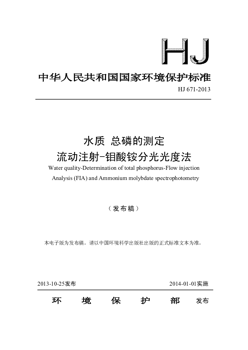 简介:HJ 671-2013 水质 总磷的测定 流动注射-钼酸铵分光光度法(发布稿)