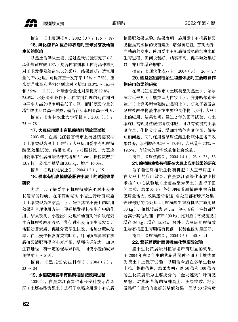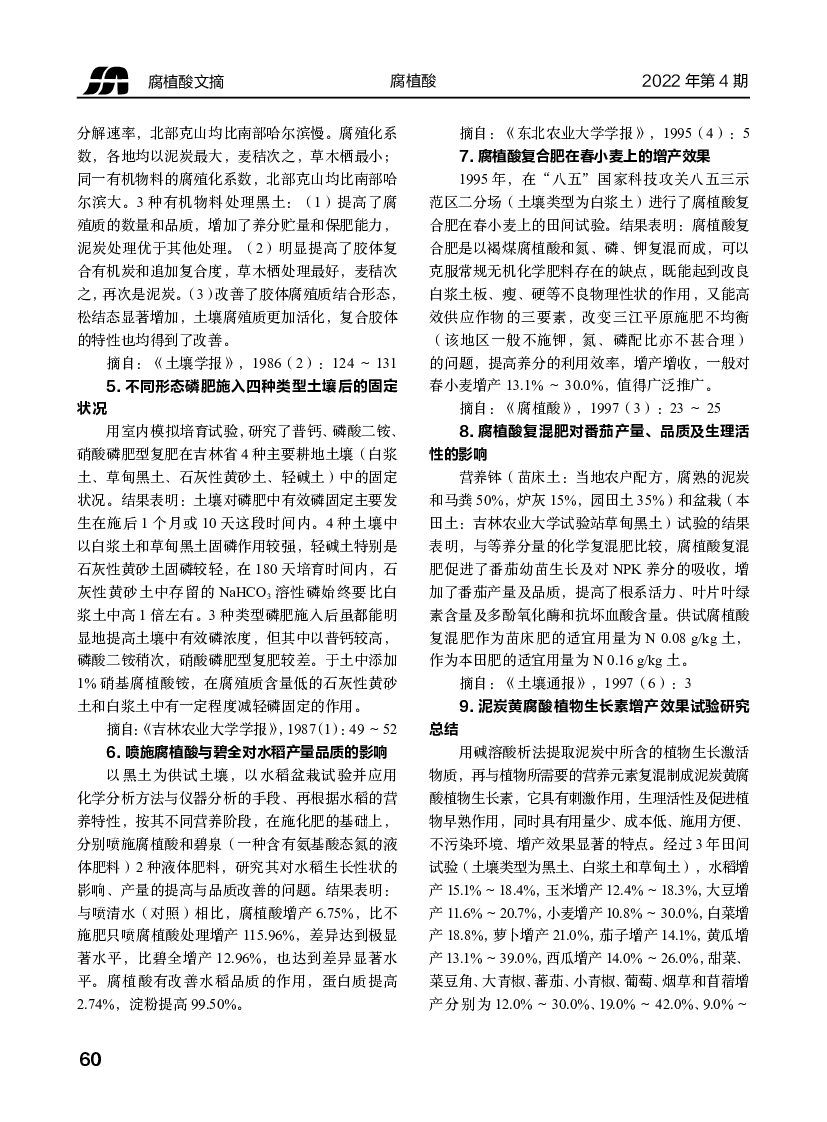 简介:黑土地是“耕地中的大熊猫”。黑土地土壤类型包括黑土、黑钙土、草甸土、白浆土、暗棕壤、棕壤等。2022 年8 月1 日,《中华人民共和国黑土地保护法》正式施行。编辑部以“中国知网”数据库内容为依据,通过搜索“腐植酸、腐殖酸、黄腐酸、棕腐酸、黑腐酸、胡敏酸、富里酸、泥炭”+“黑土、黑钙土、草甸土、白浆土、暗棕壤、棕壤”等专用词,遴选出100 篇腐植酸在黑土地应用方面的文献摘要,现按时序分享给大家,以表百事和好。