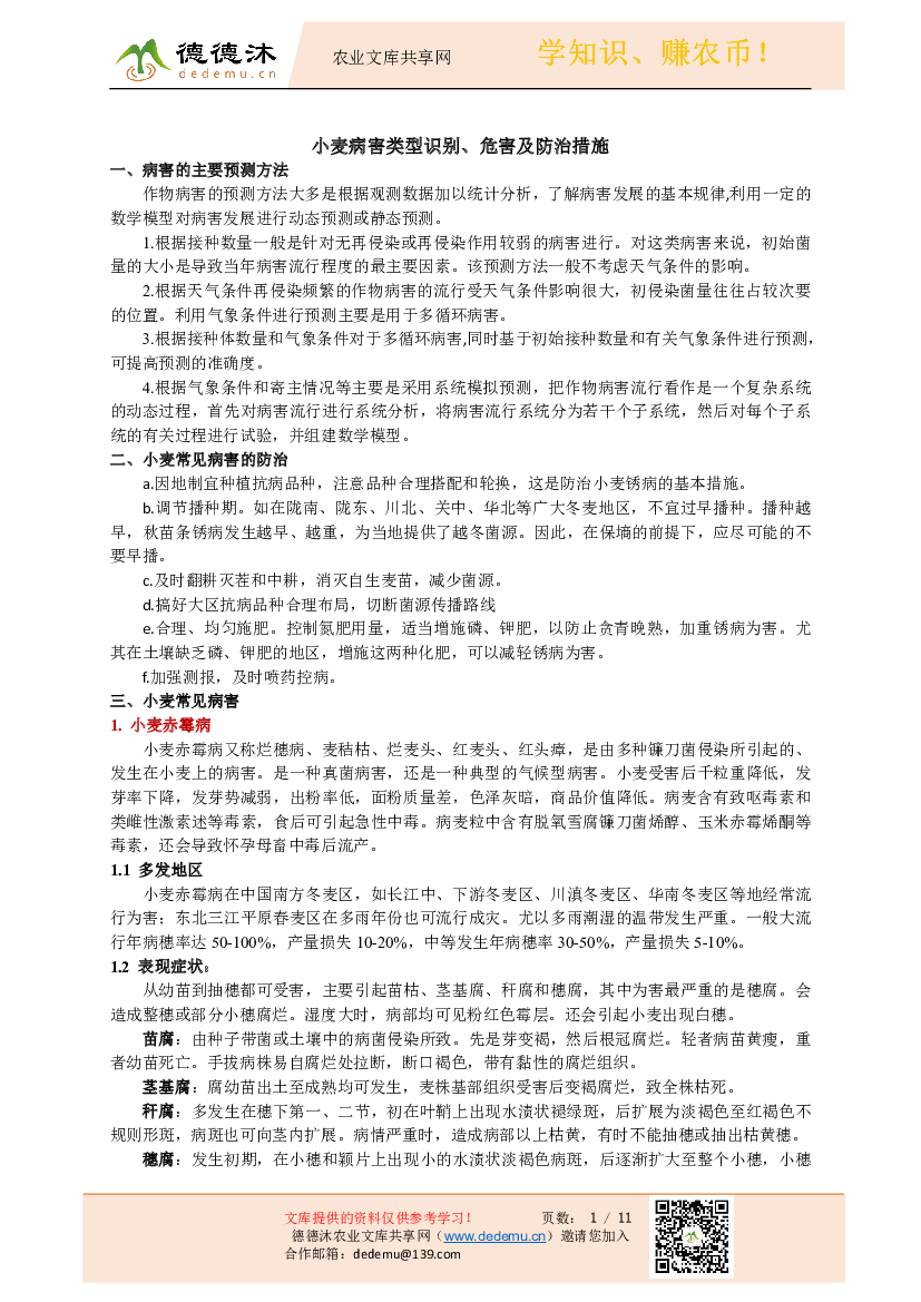 简介:文档对各类型的小麦病害进行描述,对不同病害的多发地区,影响环节、诊断方式和防治措施进行阐述,附加病害图,方便大家深入了解。