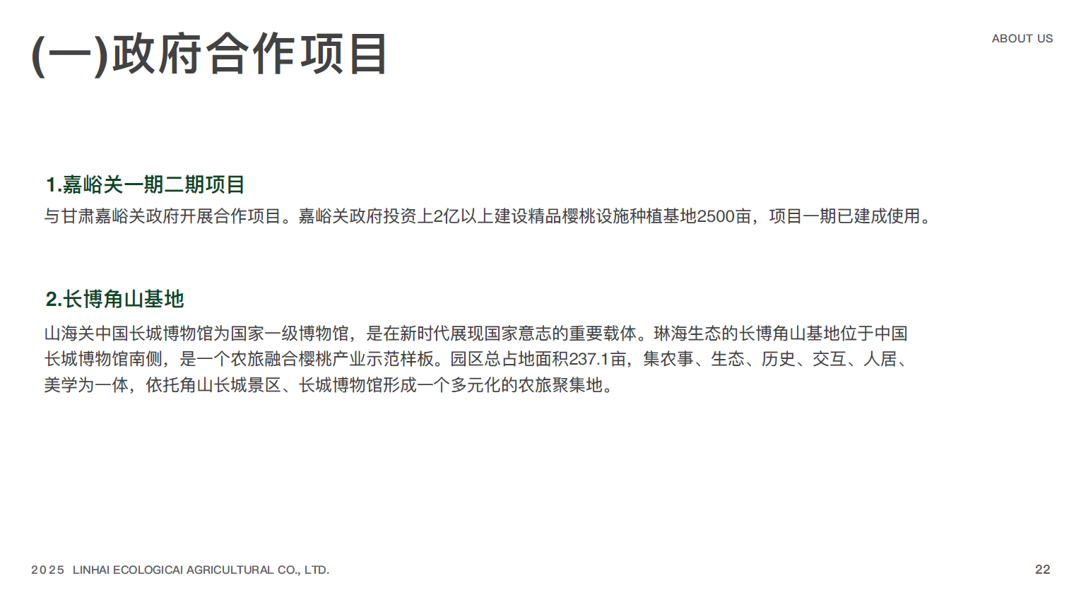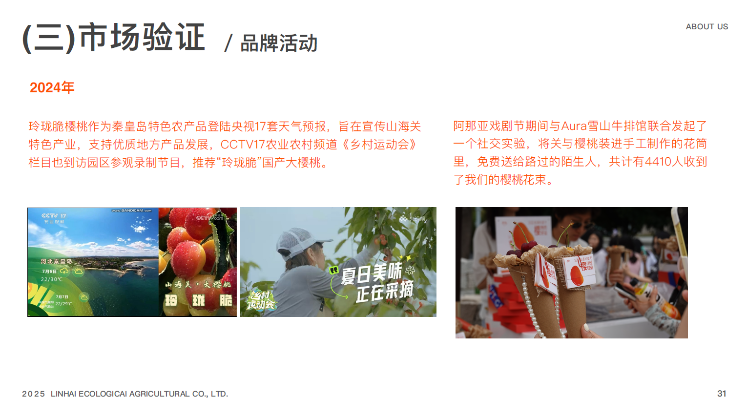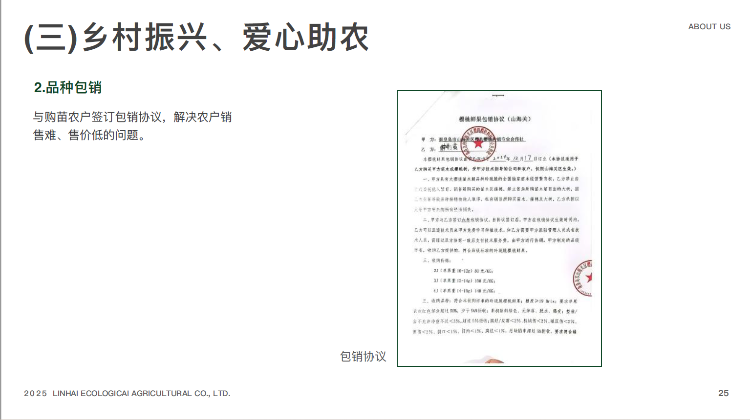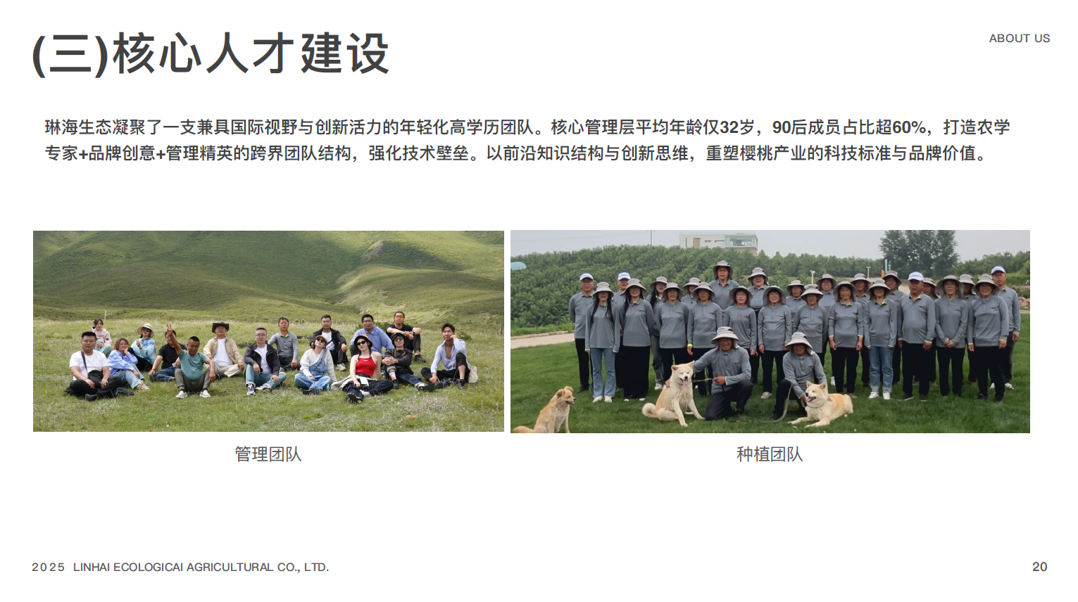 简介:秦皇岛琳海生态农业有限公司成立于2020年,是一家年轻的樱桃全产业链生产公司。公司业务包含樱桃苗繁育、樱桃种植、苗木销售、鲜果销售、樱桃酒加工等,旗下拥有樱桃鲜果品牌“关与”樱桃,及樱桃酒品牌“樱韵”。
