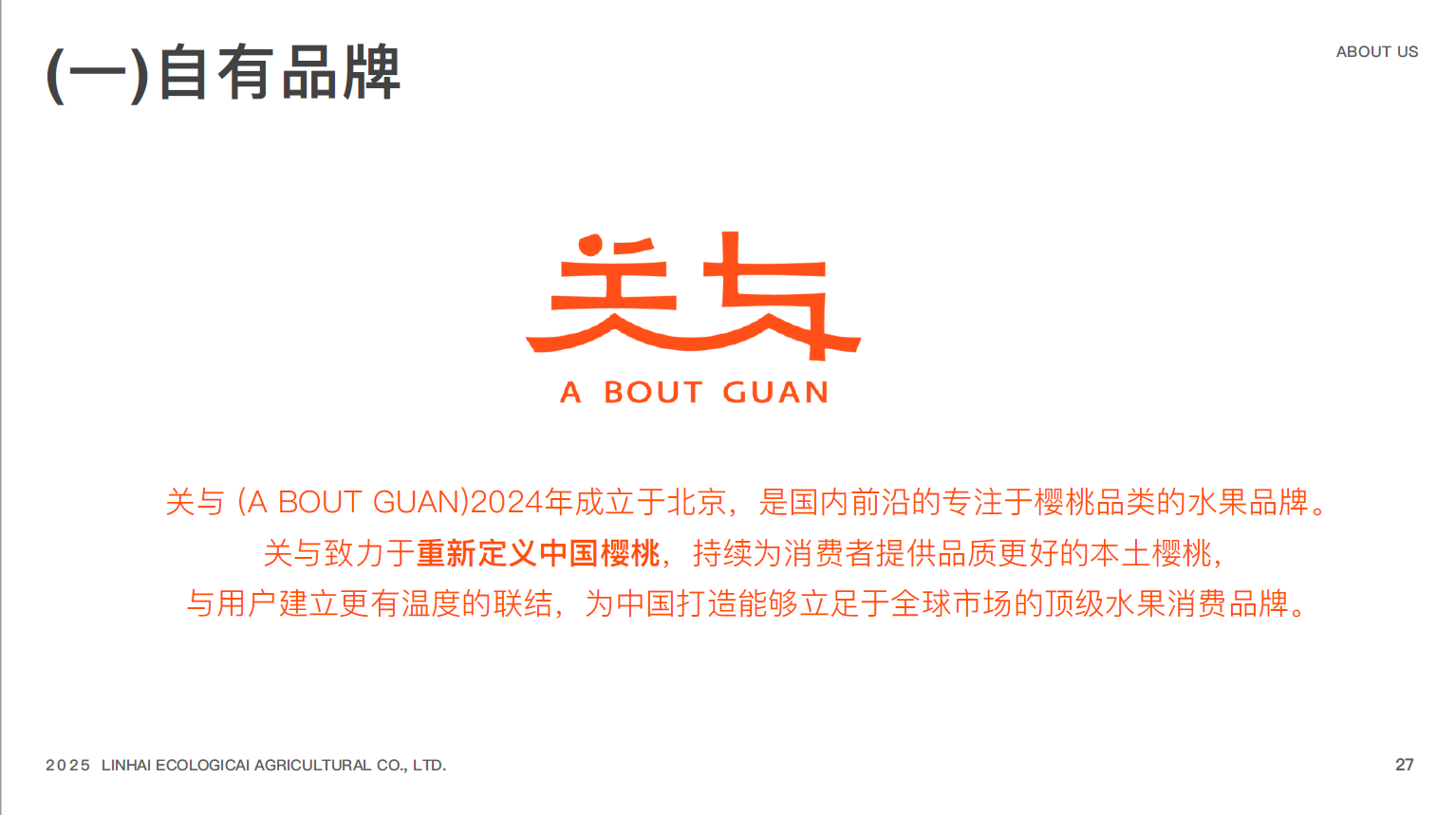鲜果销售、樱桃酒加工等,旗下拥有樱桃鲜果品牌“关与”樱桃,及樱桃酒品牌“樱韵”。